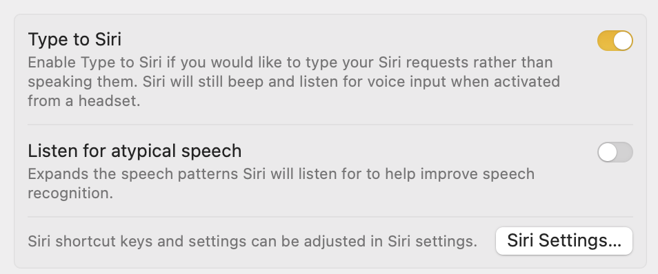 The Siri page enables you to Type to Siri, something that I keep active on all my Macs because I would rather not have the different device kinds to all react to “Hey Siri”. It will still listen to requests activated vocally when wearing a headset.