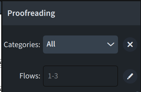 There is a badge at the bottom indicating how many issues Dorico has found in the defined categories and flows. In large projects—such as the one used to capture the screenshot, with a hundred flows—it is useful to narrow down issues by flow or category, which Dorico allows via the Proofreading panel that opens after pressing the button. It is also possible to access it via the app’s menu through Write ▶ Panels ▶ Proofreading. Here’s how the top of the panel looks: