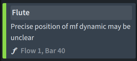 Just below that we find the list of issues Dorico found, which is in chronological order, that is, from bar 1 of the first flow to the last bar of the last flow. If the issue relates to a particular instrument, this is shown in the lower-left corner of the label, with a general description accompanying the report.