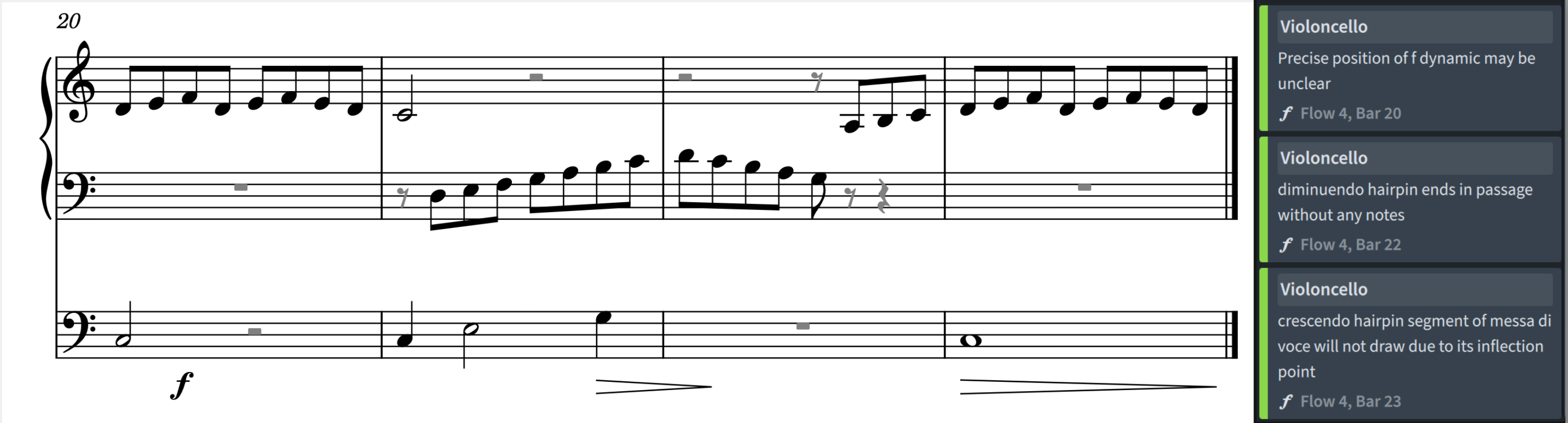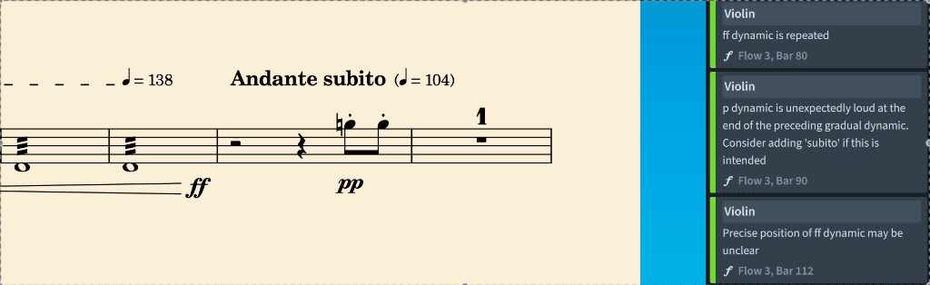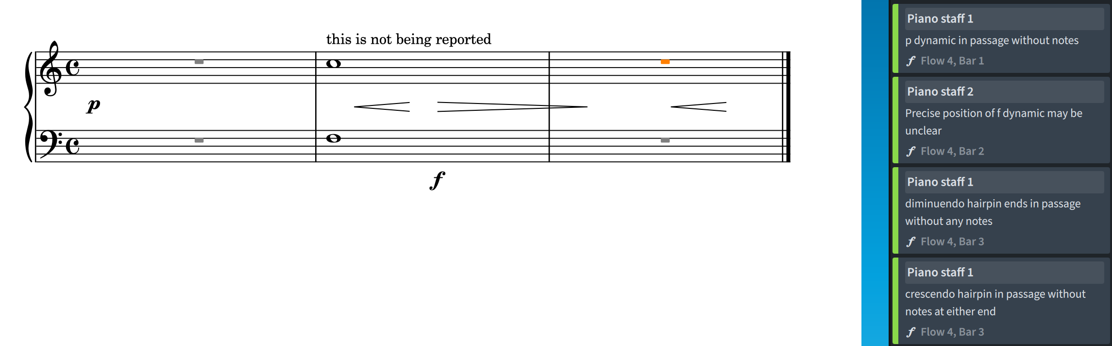 - If the music is not completely devoid of dynamics, the absence of a dynamic under the first note or chord of a player will be reported as suspicious — even though I could not reproduce it in my tests. The same will happen for the first note following an instrument change.