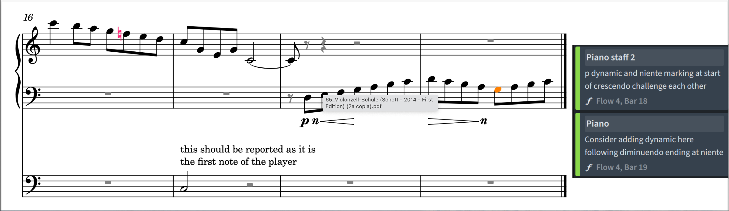 In this case, we have an issue concerning the Flute, and contains its description, the “F” music symbol signifying that this belongs to the “Dynamics” or “Suggested dynamics” category, and its location expressed in flow and bar numbers.