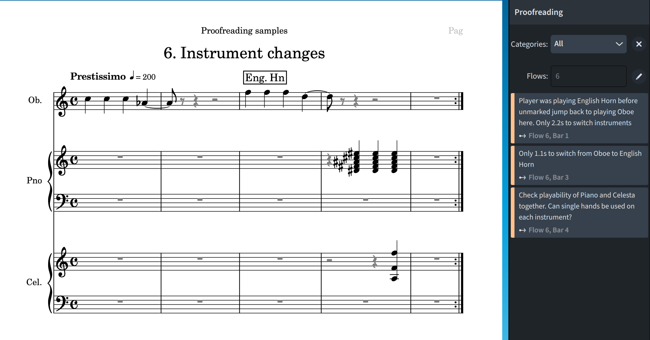 - Repeated time signatures: when there are duplicate time signatures following each other—this has bitten me very recently and the Proofreading tool saved my day (in a full orchestral score I had three consecutive 6/8 objects, in different pages and separated by rehearsal marks and double barlines).
