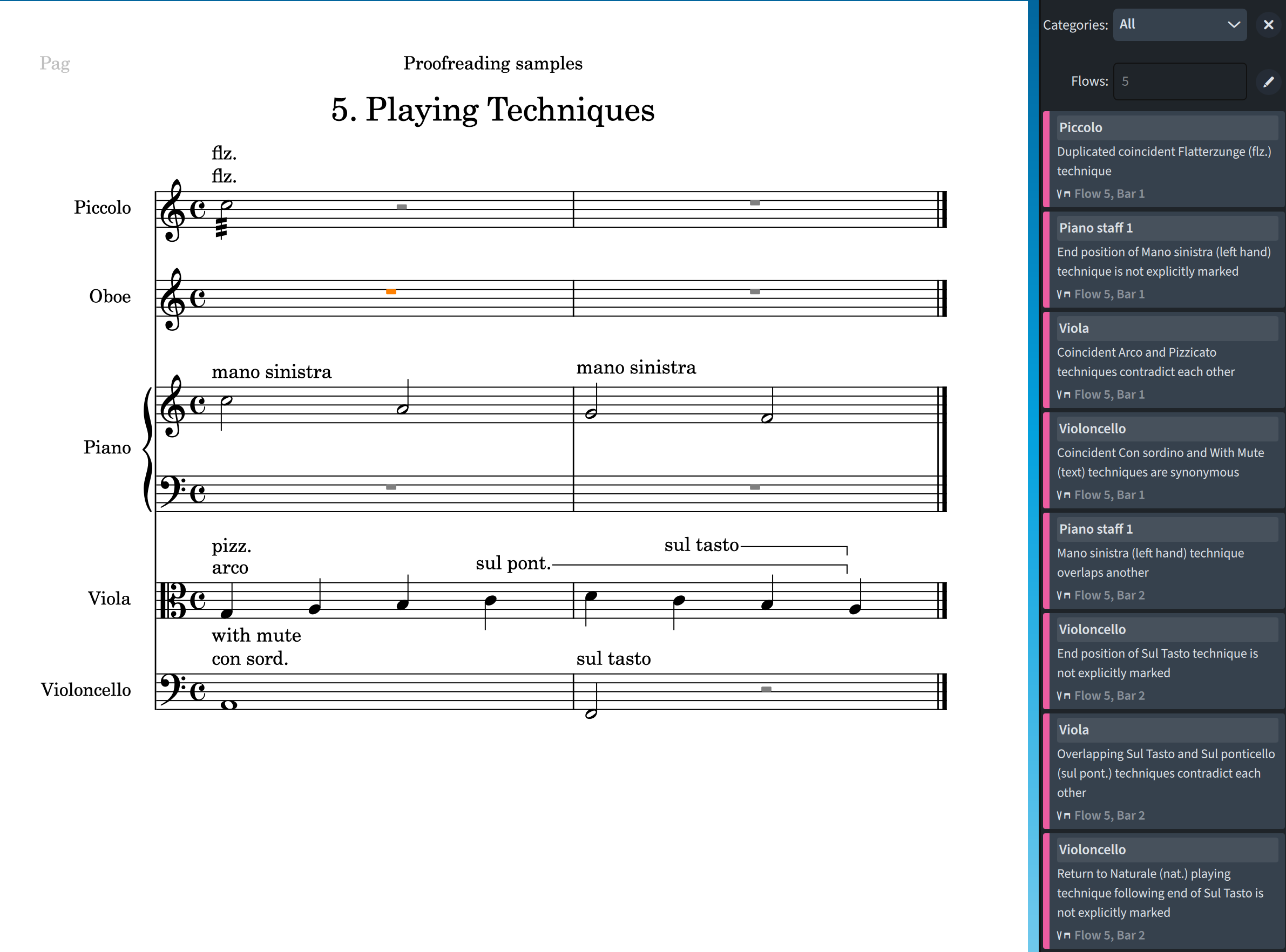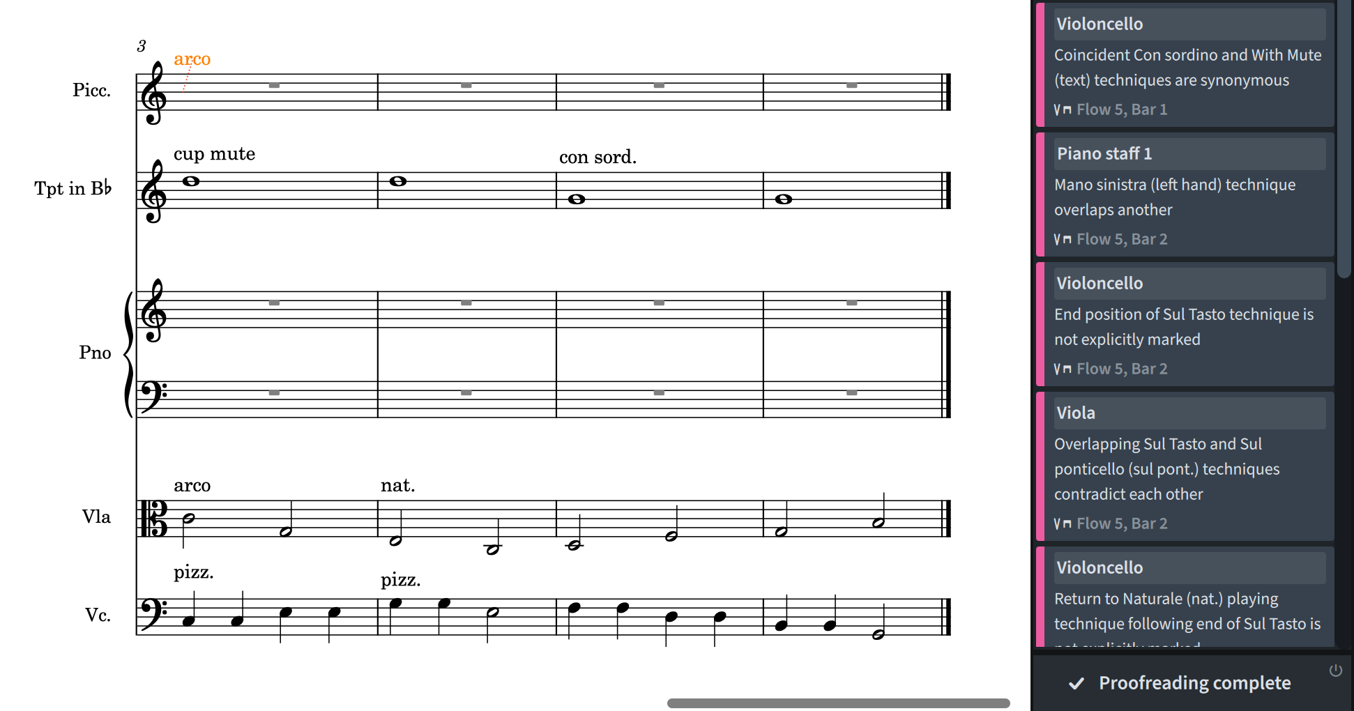 Clicking on a result in the list brings that area into view, using an animated purple rectangle to draw your attention. If the issue concerns something missing (e.g., a missing time signature or dynamic), a purple arrow will appear instead.