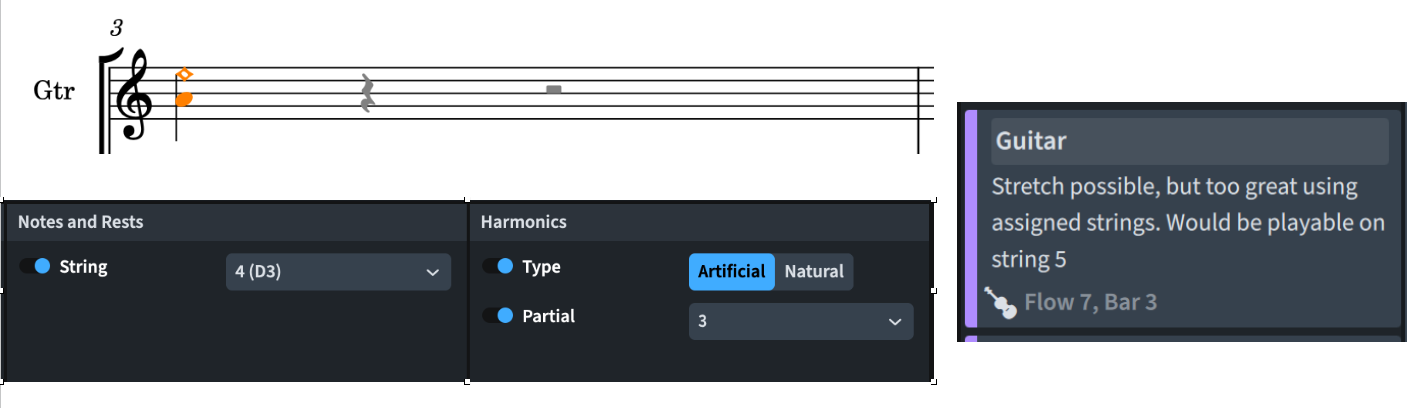 - Dubious number of natural harmonics: for example, when one has a dyad where one of the notes should be played as a natural harmonic marked with a circle. To avoid this, consider using Playing Techniques.