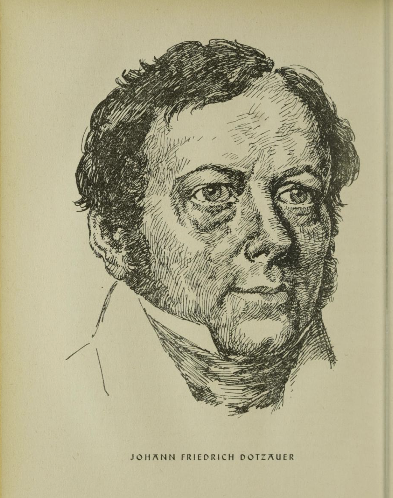 Music was pursued enthusiastically in his father’s house; after all, the figure of a Protestant pastor was difficult to imagine without serious music cultivation. The musical talents of the young Dotzauer soon became evident, prompting his parents to use all their means to nurture them. This meant giving him a solid general music education to begin with. He went on to live with his uncle, J. G. Henne, in the near Hildburghausen. There, the Court Chapel members Johann Andreas Gleichmann (1775–1842) and Johann Peter Heuschkel1 (1773–1853) taught him to play the piano and the violin. Later on, he received lessons in composition from Johann Caspar Rüttinger (1761–1830), a student of Johann Christian Kittels (1732–1809) who, in turn, had been a direct student of Johann Sebastian Bach (1685–1750)2. He also learnt how to play the French horn and the clarinet—the first of which would receive a now lost double concerto for two horns and orchestra, while the second would get a Divertimento for clarinet and orchestra, Op. 68).