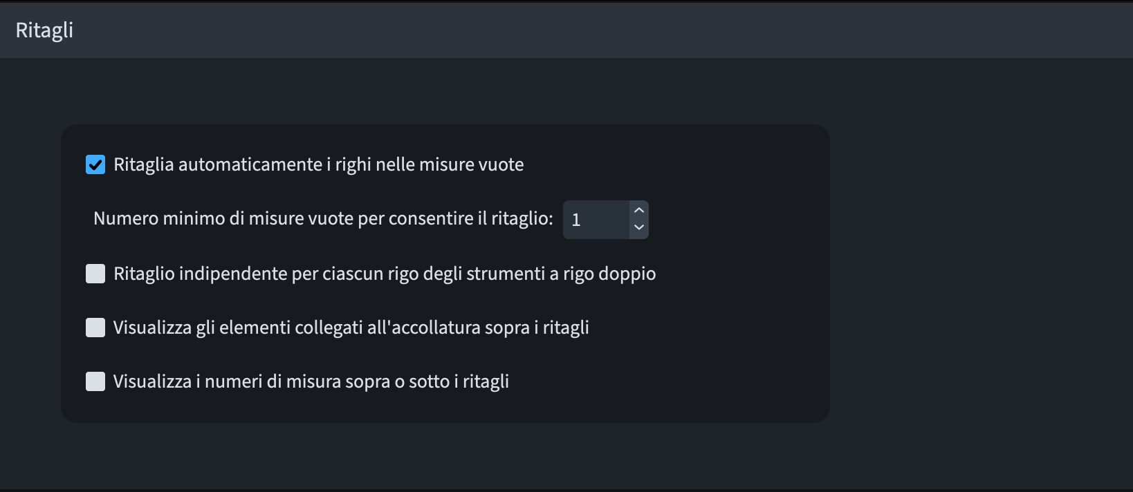 Spuntando questa opzione avrete accesso a quelle sottostanti: Numero minimo di misure vuote per consentire il ritaglio, che per impostazione predefinita è 1, nasconderà il materiale in un rigo all’inizio della prima battuta vuota che trova. Un altro aspetto importante da considerare è che uno strumento verrà ritagliato completamente solo se tutti i suoi righi sono vuoti. Se volete permettere che i righi di uno strumento a rigo multiplo vengano ritagliati indipendentemente, spuntate la terza opzione dall’alto.