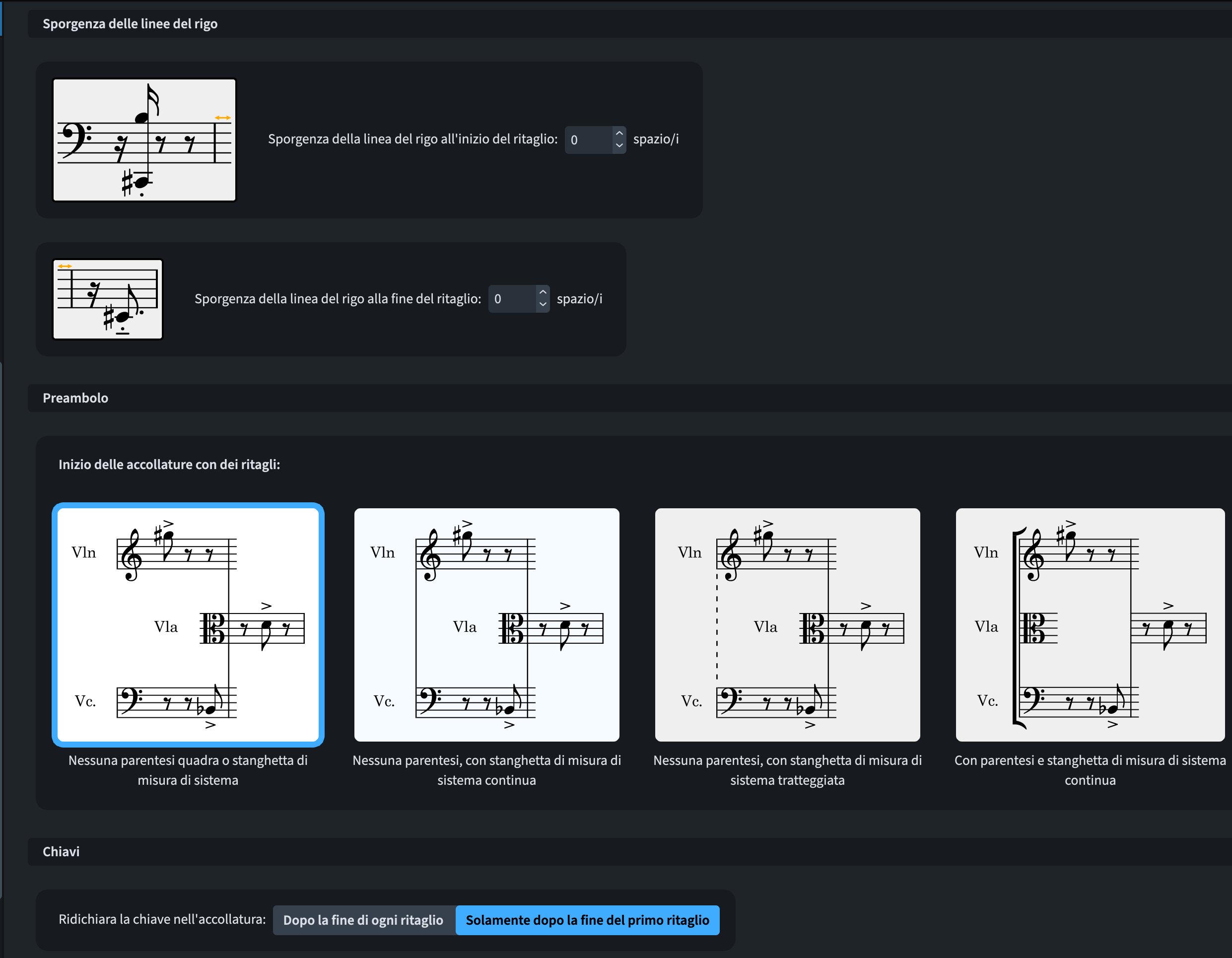 All’inizio dell’accollatura, il preambolo dello strumento (etichetta del rigo, chiave, ecc…) è solitamente nascosto nelle partiture con ritagli; alcune di esse, tuttavia, preferiscono mostrarlo. Ci sono quattro opzioni tra cui scegliere nella sezione Inizio delle accollature con dei ritagli mostrata sopra: