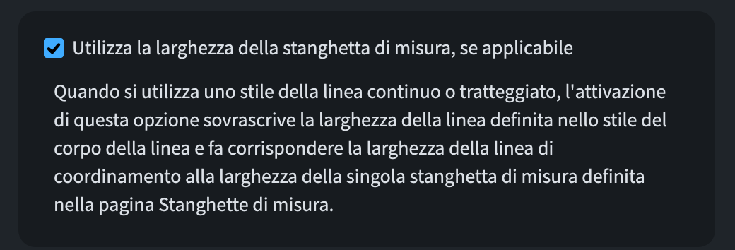 L’elenco a discesa includerà anche gli stili personalizzati che avete creato. La casella Inverti può essere utile quando si usano stili di linea con punte di freccia. La larghezza della linea corrisponderà al valore Spessore delle stanghette di misura sottile che si trova nella pagina Stanghette di misura delle Opzioni tipografiche, dato che le linee di coordinamento sono più spesso disegnate tra stanghette. Se volete sovrascrivere questo, deselezionate la casella Utilizza la larghezza della stanghetta di misura, se applicabile.