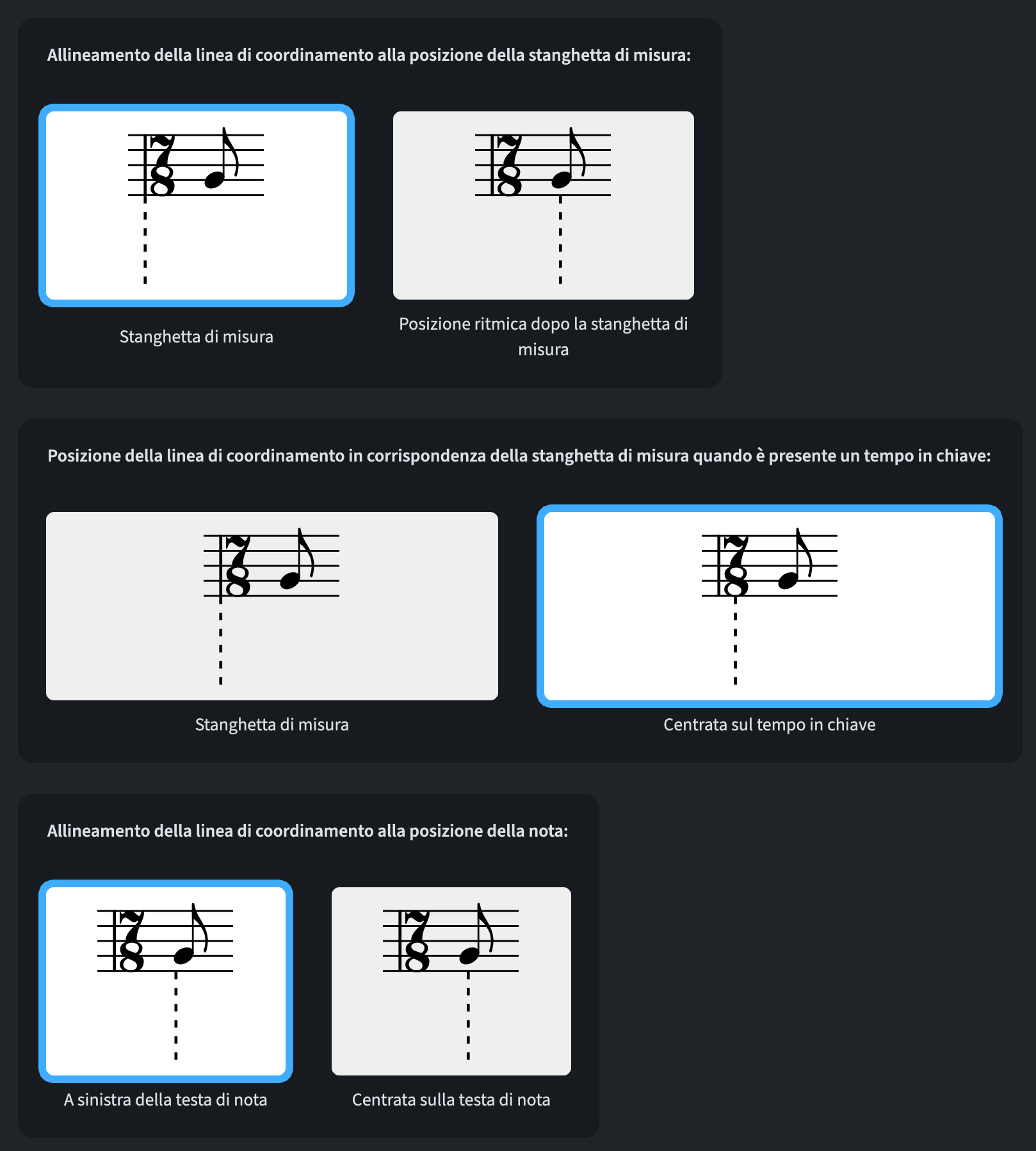 Ci sono diverse opzioni che si trovano nella pagina Linee di coordinamento della finestra di dialogo Opzioni tipografiche. Possiamo riassumerle come segue: