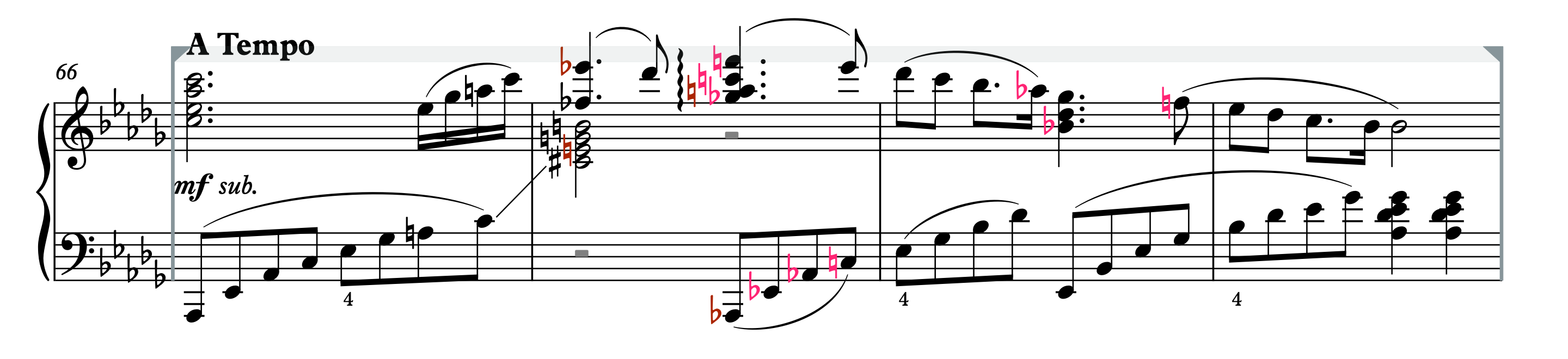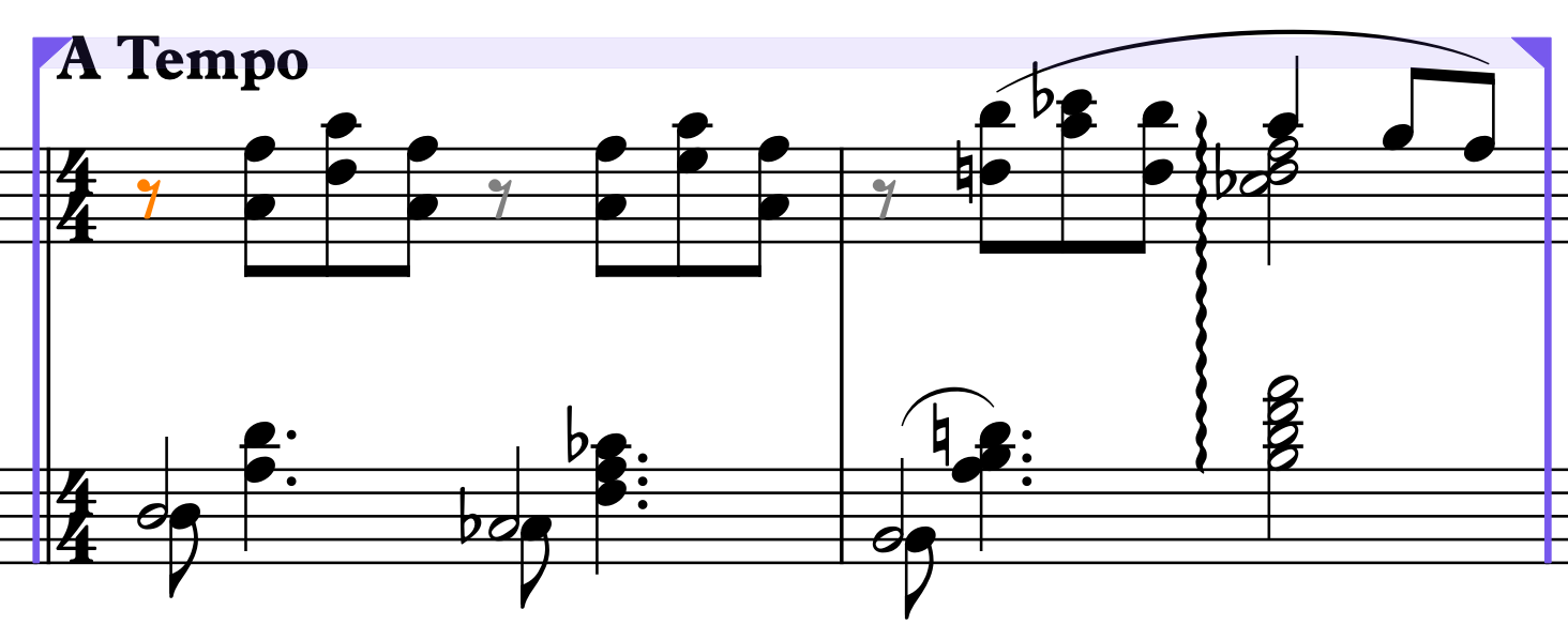 Notate le due linee verticali con dei triangoli rivolti verso l’interno e il tenue nastro grigio che le unisce. È così che Dorico evidenzia una regione di riproduzione ciclica. Il colore grigio è importante, quindi tenetelo a mente per ora.