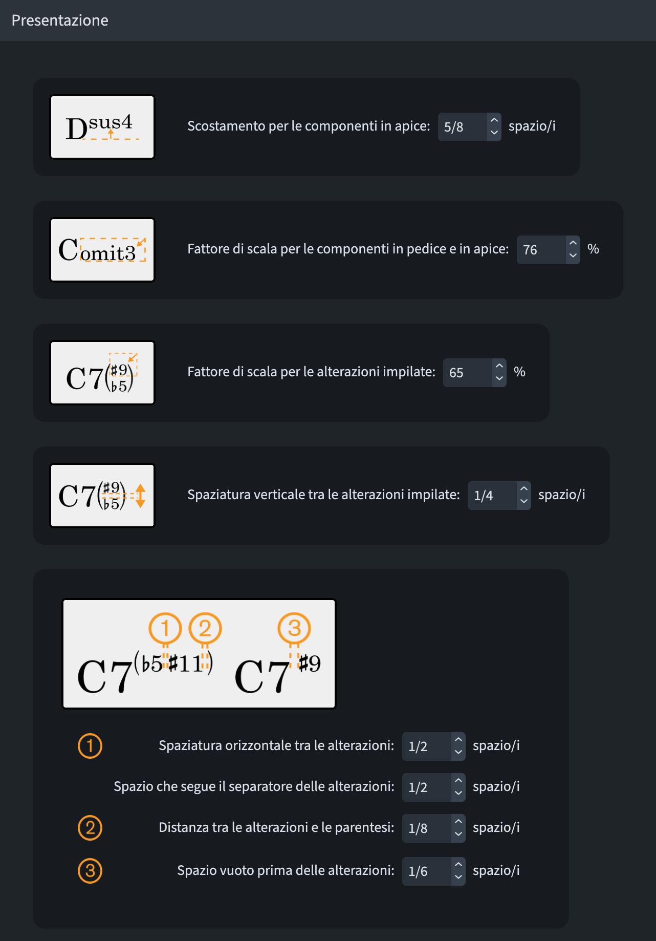 L’aspetto generale dei simboli di accordo può già essere regolato a un livello fanatico di precisione attraverso Opzioni tipografiche ▶︎ Simboli di accordo. Ecco un assaggio dalla sezione Presentazione: