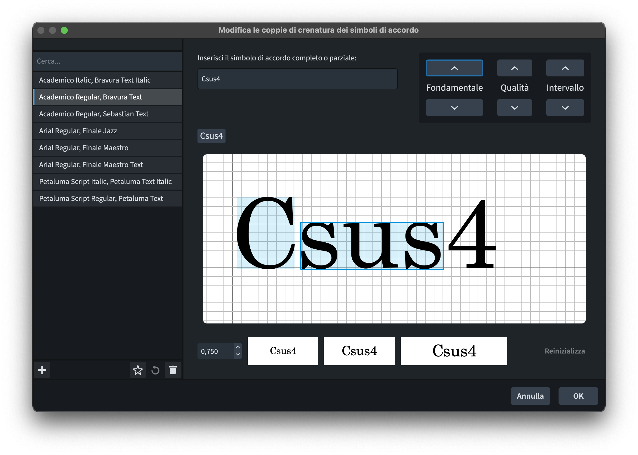 - In Opzioni tipografiche ▶︎ Simboli di accordo, scegliete un Preset simboli di accordo che sia il più vicino alle vostre preferenze;