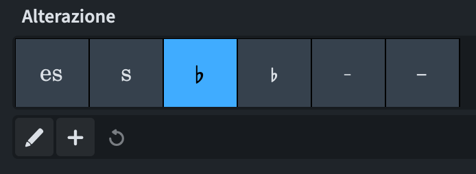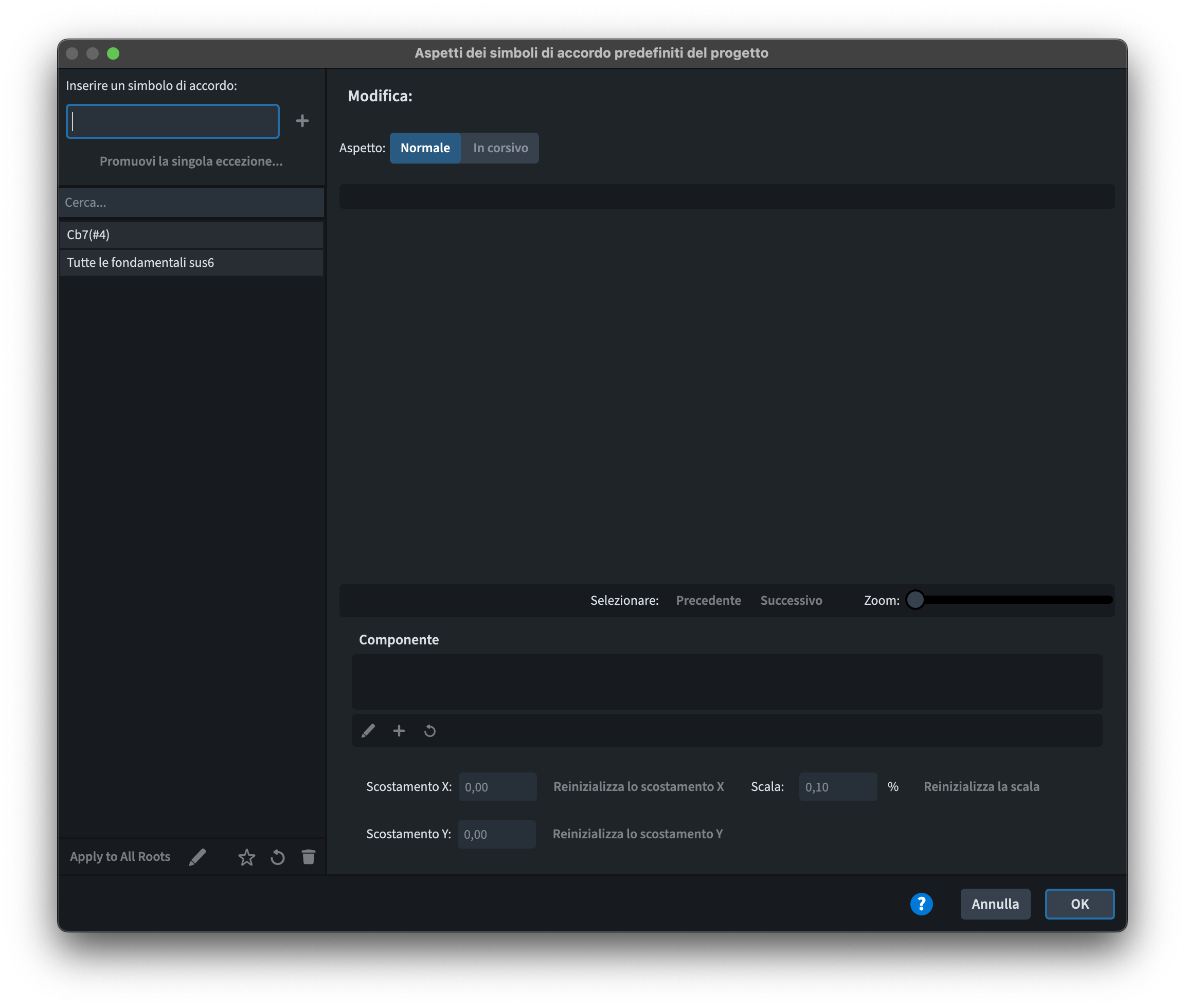 Toccare il pulsante Modifica componente (a forma di matita) apre l’editor di simboli—simile a quello che si aprirebbe in Libreria ▶︎ Simboli musicali… Fate attenzione che qualsiasi cambiamento eseguito qui verrà applicato a tutti i simboli di accordo dove tale componente è presente. Qualora vogliate modificare questo componente senza influenzare i simboli di accordo esistenti, vi basterà premere il pulsante + (Aggiungi componente). Questa azione salverà il nuovo componente nella libreria del progetto ma farà sì che nessun simbolo di accordo lo usi come impostazione predefinita. Mi raccomando, non dimenticate di premere il pulsante OK quando avete finito.