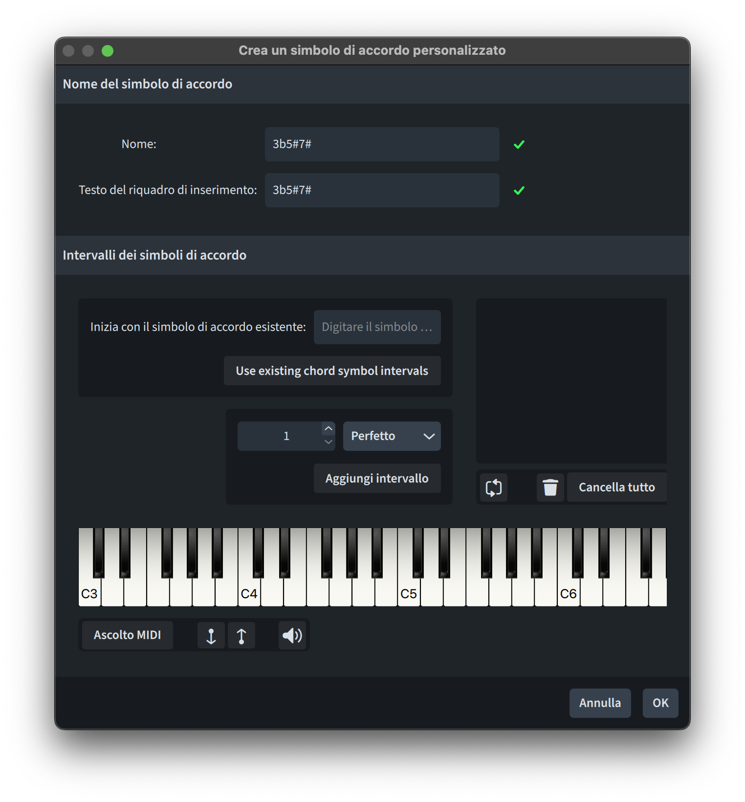 In questo caso, abbiamo scritto “3b5#7#” nel campo di testo, che significa “terza abbassata, quinta e settima alzata”. Nei campi Nome: e Testo del riquadro di inserimento:, vedrete il testo che avete inserito prima di premere OK. Se il contenuto è valido, apparirà un segno di spunta verde a destra. Quando inserirete un accordo vero e proprio, dovrete inserire una fondamentale, ad esempio, Do, e poi aggiungere “3b5#7# a essa.
