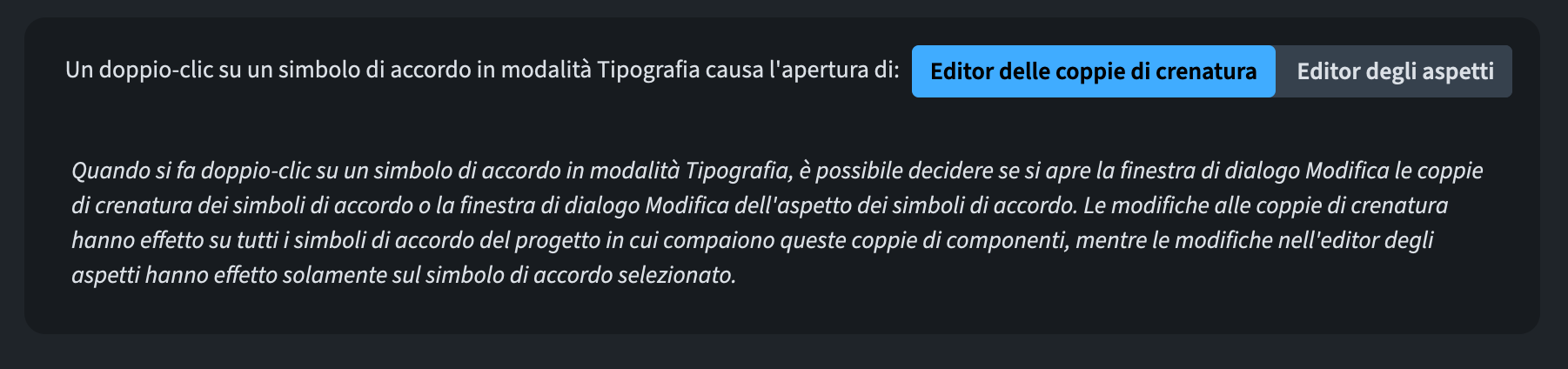 Per impostazione predefinita, fare doppio clic in Modalità tipografia su un simbolo di accordo lo aprirà nell’editor delle coppie di crenatura. Se preferite che tale azione apra invece l’Editor dell’aspetto, modificate l’opzione pertinente nelle Preferenze: