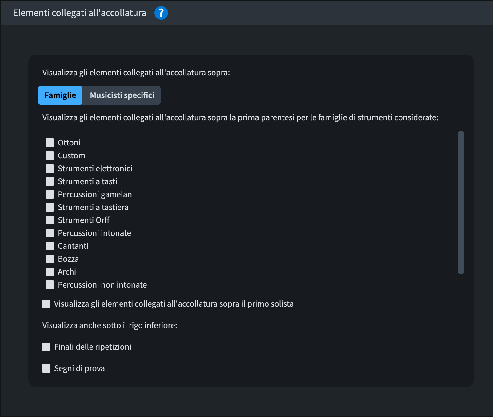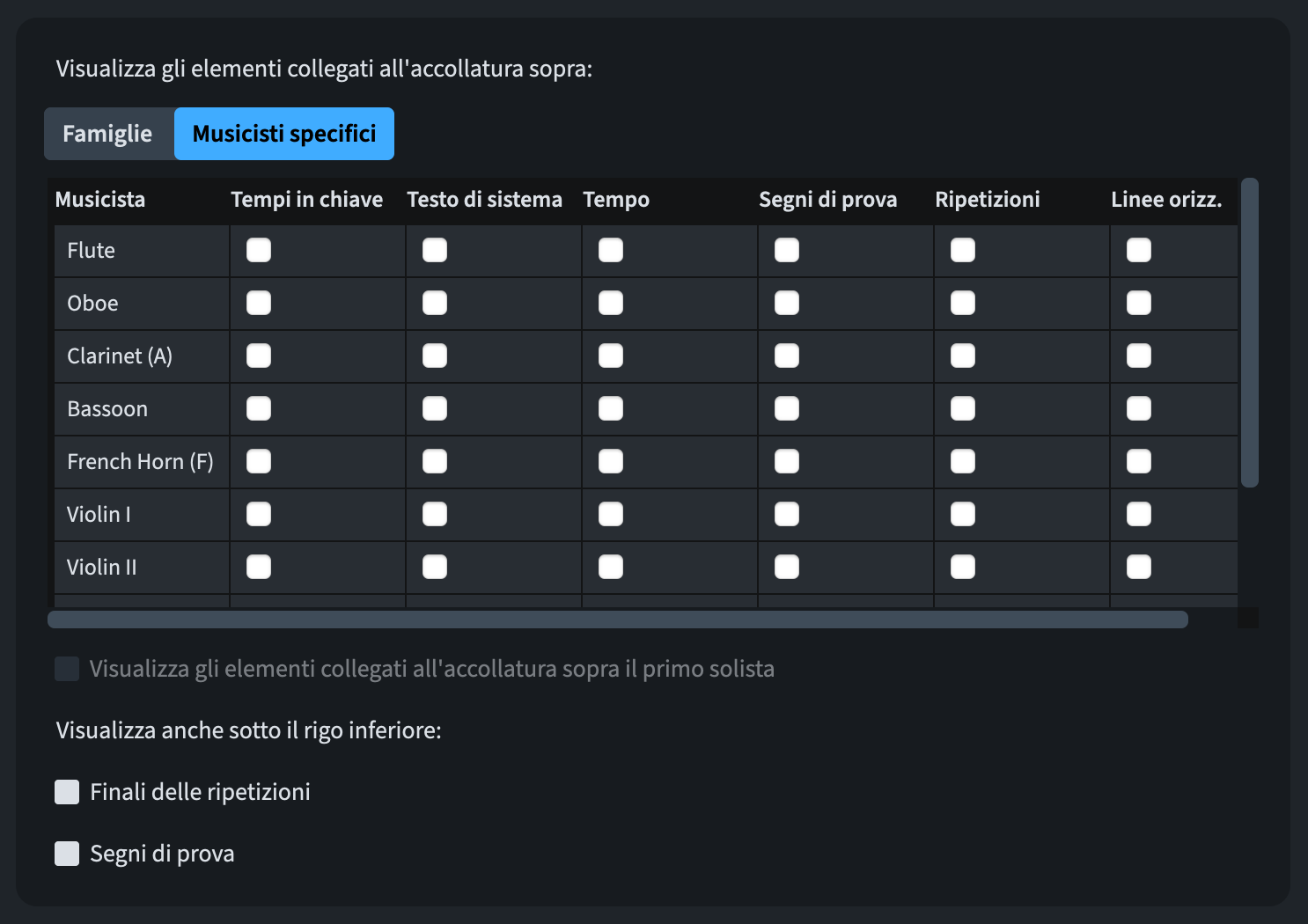 Potete ora spuntare ogni casella indipendentemente per assicurarvi che ogni elemento collegato all’accollatura sia posizionato esattamente come desiderate. Questo è particolarmente utile se avete indicazioni di tempo lunghe che causano lo spostamento dei richiami per la concertazione troppo lontano dal rigo, creando così problemi di impaginazione. Questo può ora essere risolto posizionando le indicazioni di tempo nella parte superiore dell’accollatura e i richiami sopra un altro gruppo, ad esempio, sopra gli archi.