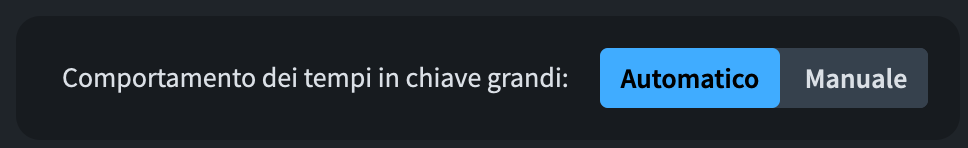 Lo stesso tipo di miglioramenti è stato apportato alle indicazioni metriche di grandi dimensioni, che ora possono essere posizionate in corrispondenza di gruppi specifici di musicisti. Ma non è tutto: per ogni gruppo, è ora inoltre possibile specificare l’allineamento verticale dell’indicazione metrica. In Opzioni di Layout ▶︎ Tempi in chiave, impostate la Posizione e dimensione dei tempi in chiave: su Visualizza una volta per ciascuna parentesi e poi toccate il pulsante Manuale nel controllo segmentato sottostante: