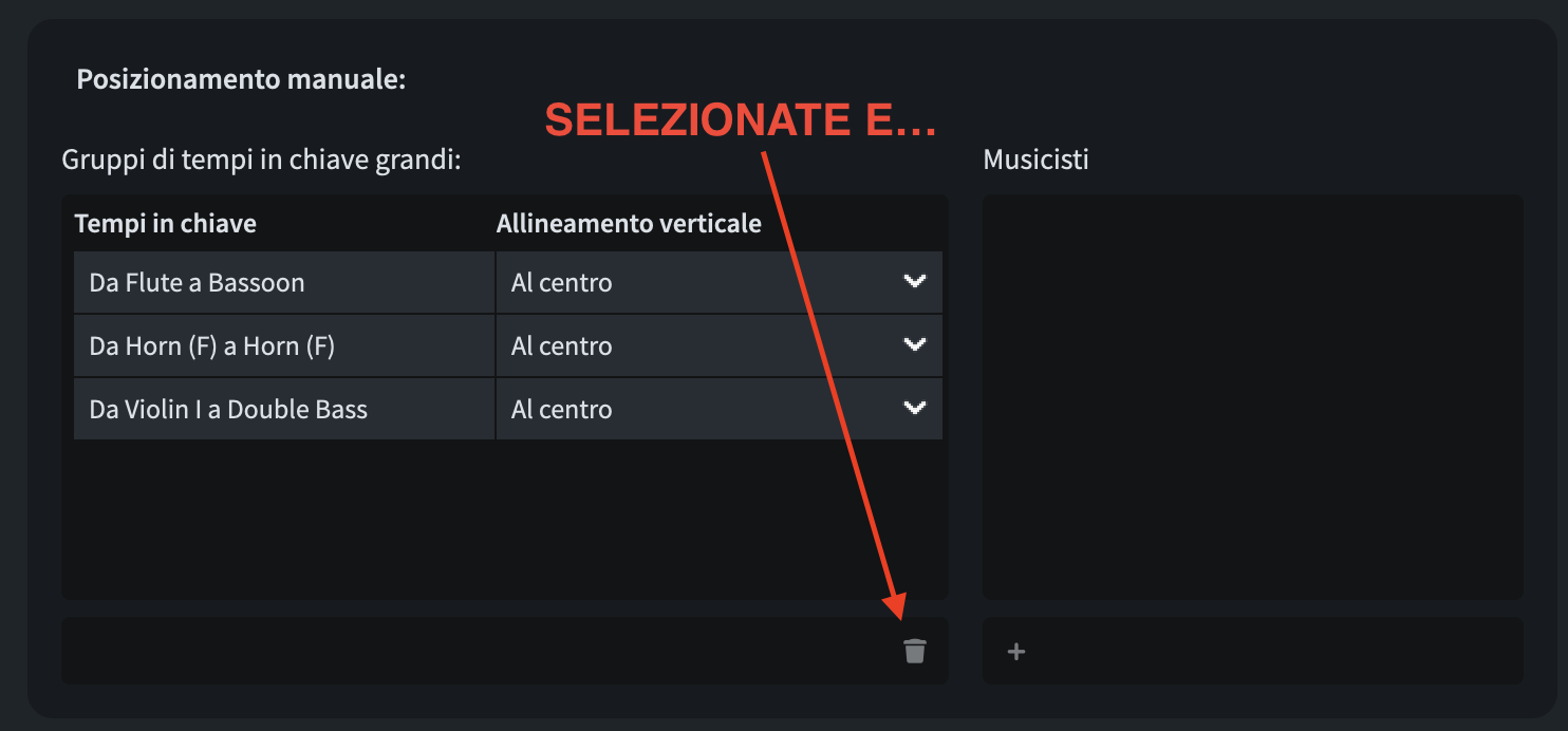 Non tutti i musicisti devono per forza essere assegnati a un gruppo; impostate semplicemente quelli sopra i quali volete che appaiano le indicazioni metriche.