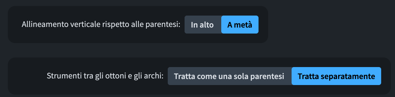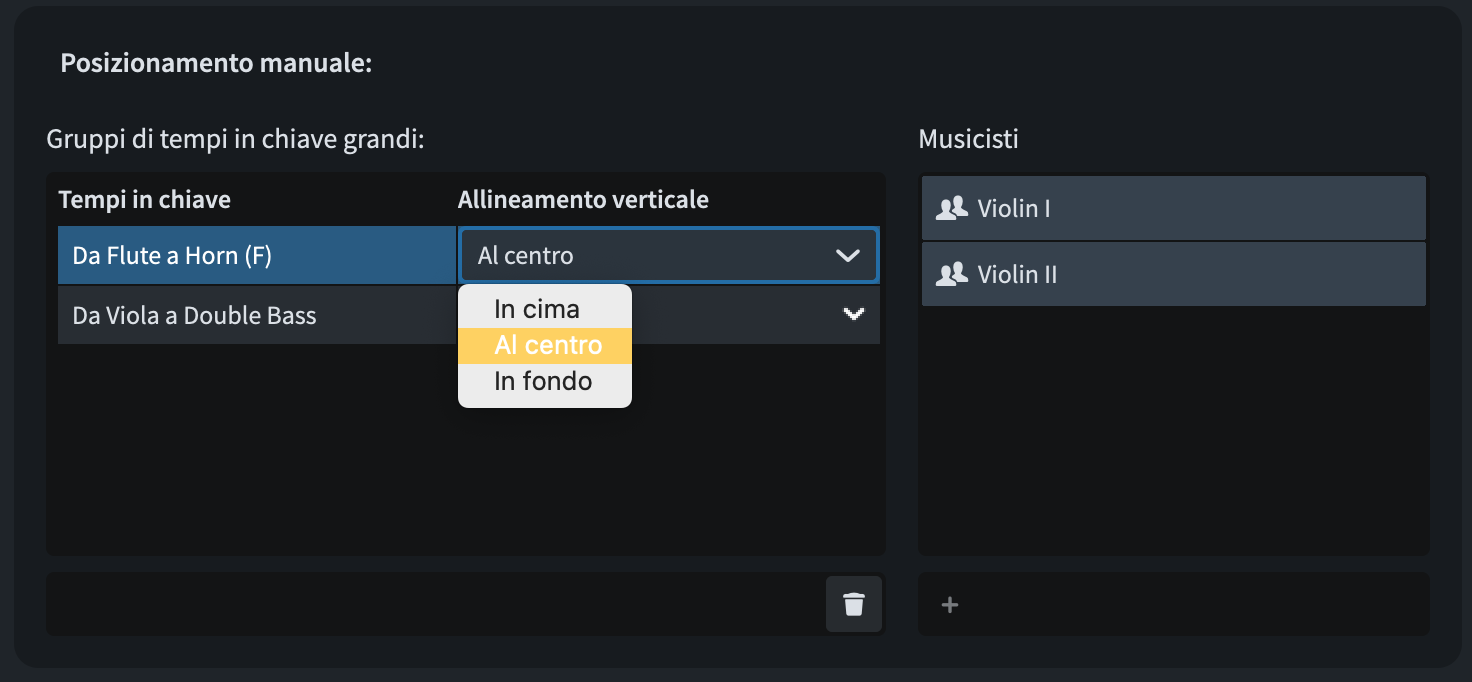 La prima governa l’allineamento verticale predefinito quando create un nuovo gruppo (o se usate la modalità automatica). La seconda vi permette di decidere se gli strumenti tra gli ottoni e gli archi (percussioni, arpa, pianoforte, solisti, ecc.) dovrebbero essere considerati come una singola unità.