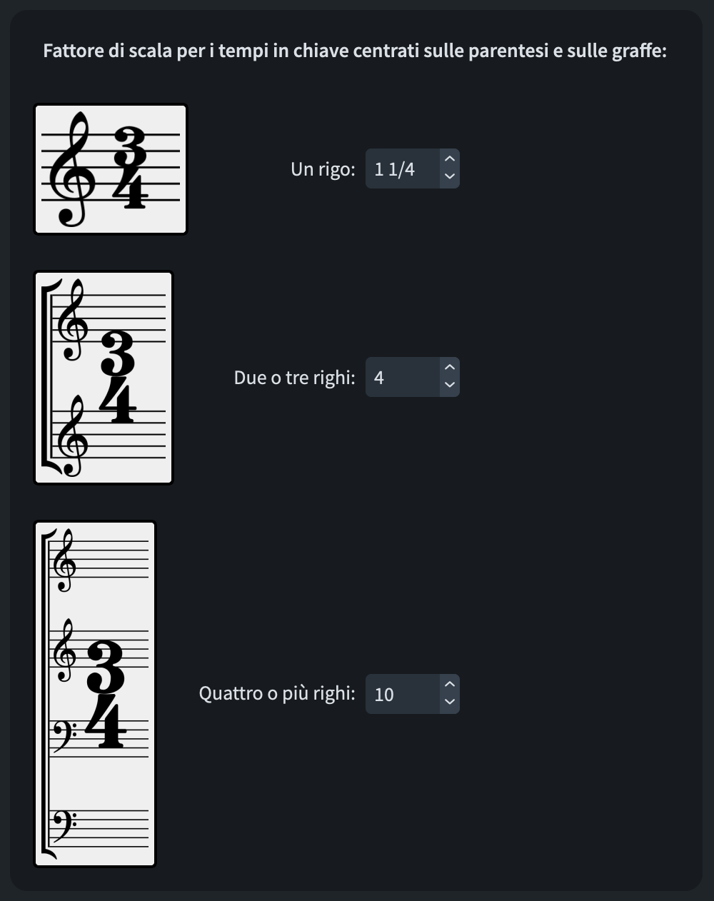 È possibile che, una volta impostate accuratamente queste opzioni, non siate del tutto soddisfatti del fattore di scala delle indicazioni metriche risultanti. La soluzione sarà di andare in Opzioni tipografiche ▶︎ Tempi in chiave ▶︎ Tempi in chiave centrati sulle parentesi e regolare con precisione il fattore di scala per ogni possibile occorrenza: