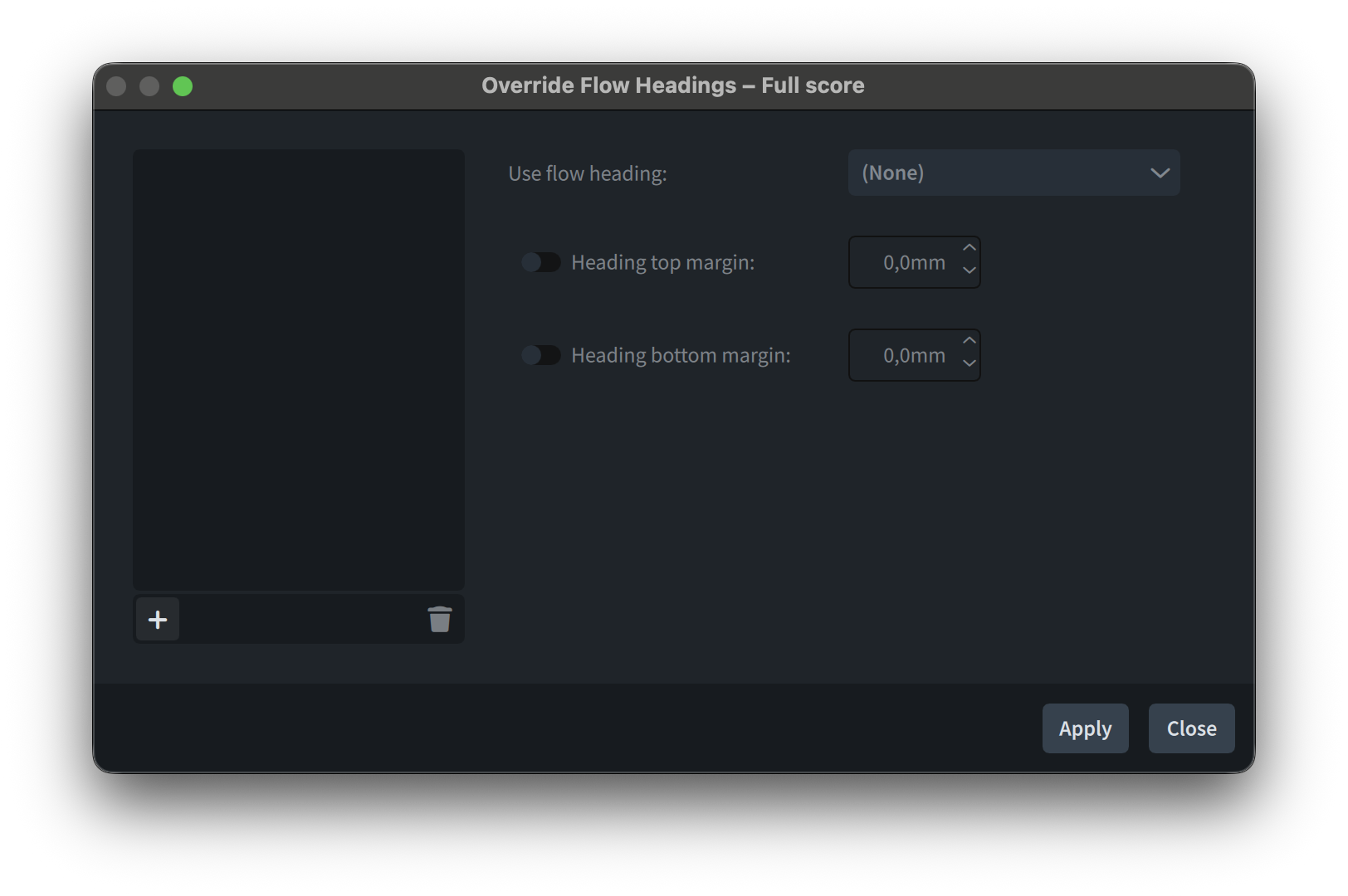 Since every flow will use the Default flow heading until instructed otherwise, you will need to add a flow to the list of “the rebel ones”. This prompts you to think carefully about the naming of your flows as, when the list becomes longer, you will not be able to remember exactly what flow contains what music otherwise. Remember, also, that Dorico will not complain if you give two different flows the same name. To continue, press the + button and pick a flow from the list. Next to the Use flow heading: label, pull down to reveal your options. If you only see “Default” and “(none)”, it means that you have not defined any custom flow heading in your project. To remedy, go to Engrave mode, press Cmd/Ctrl-9 to open the right sidebar if not already visible, scroll down to the Flow Headings section, expand it, and create a new heading. Once you are done, go back to Setup mode and apply the desired heading to your flow.