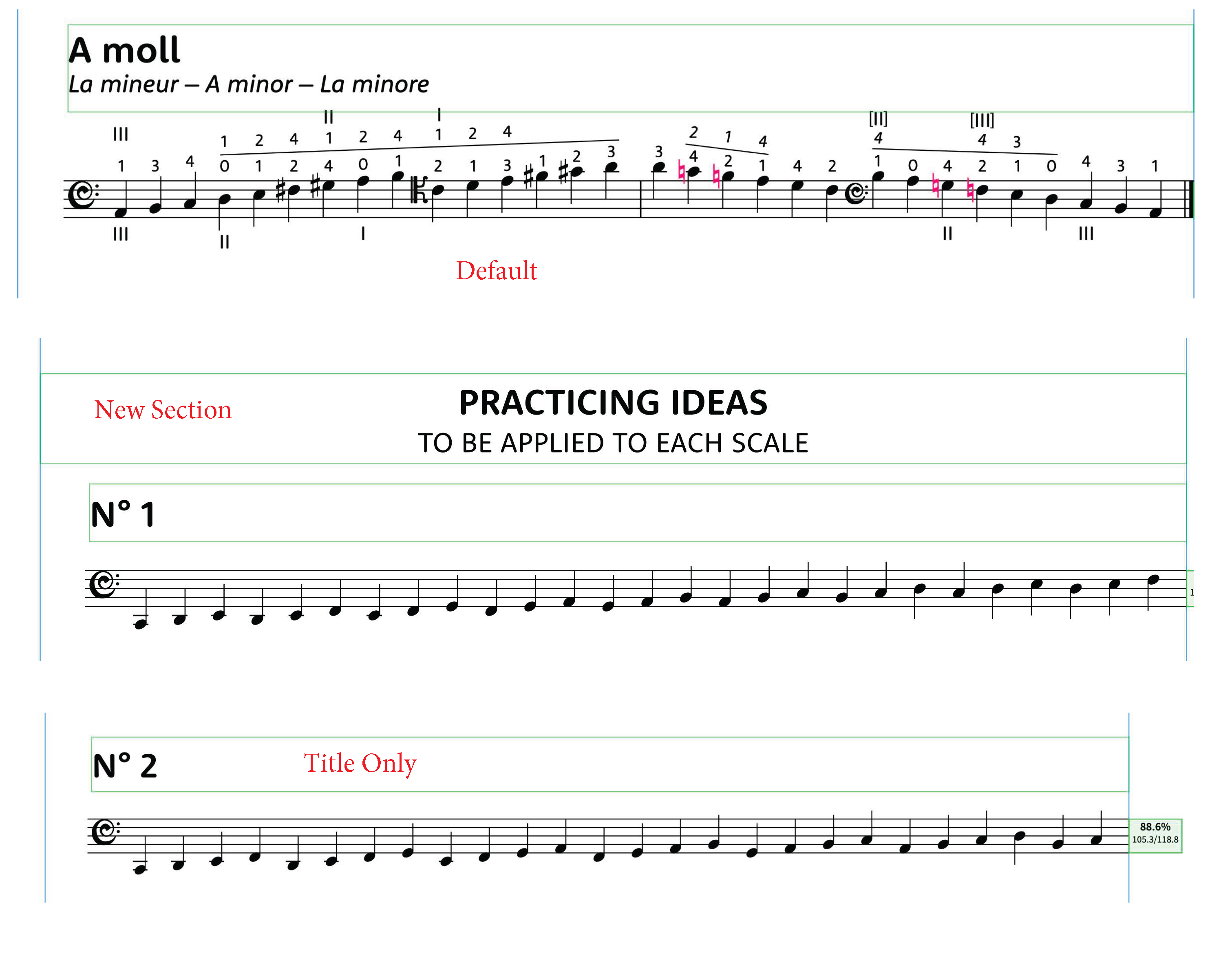 Flow headings have always been there, in Engrave mode, as a way to customise the appearance of the space at the top of each flow. It can contain information about a specific movement, the title of a song, the number of an exercise, and more. There was a limitation, though: it was possible to apply a Flow Heading Change only on a specific page. Assuming you had less than two flows per page, this had never been a problem. For projects such as this, with 90+ flows containing scales, exercises, and duets, this limitation caused several issues, forcing the user to manually override each page.