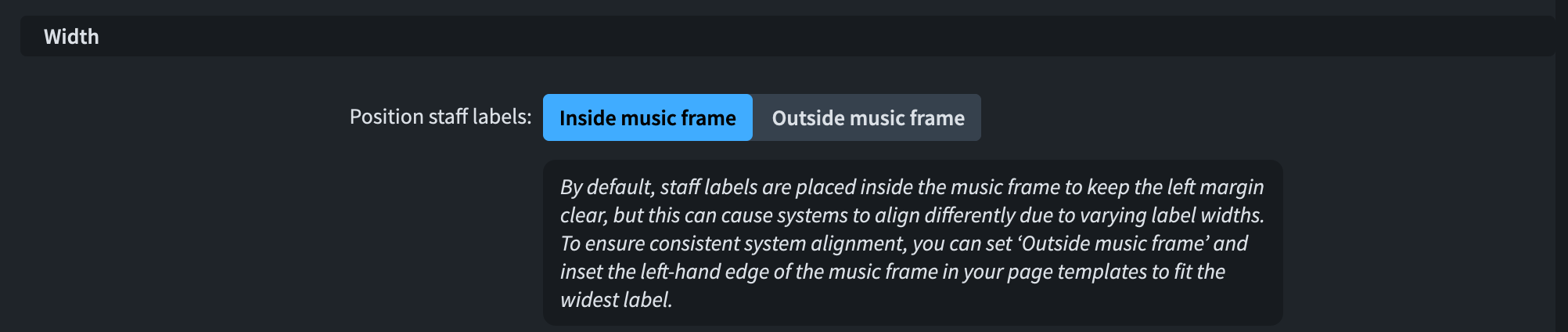 Frequently, engraving house styles require equal width systems at all costs, creating the need for placing staff labels outside the page margins when necessary. This option can be activated in Layout Options ▶︎ Staves and Systems ▶︎ Staff Labels by selecting the Ouside music frame option.