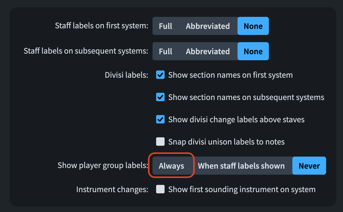 When player group labels are in use, it was previously not possible to show them if the staff labels were hidden. With version 6, now, it is instead possible to show them. Go to Layout Options ▶︎ Staff Labels, and activate this property: