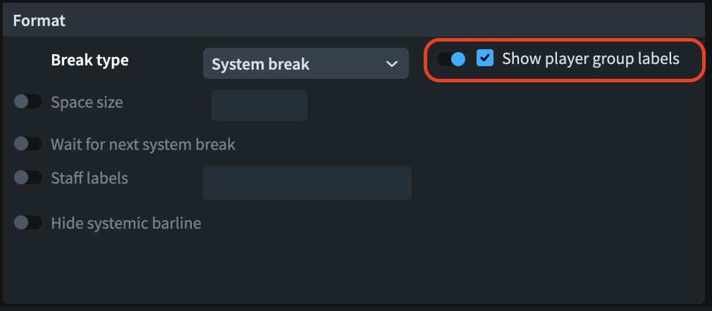 Let’s say, though, that you do not like any of the three options shown above. It is now possible to determine the visibility of player group labels at any break (system or frame) independently. Select a break and, in the lower zone (Property Panel), activate this: