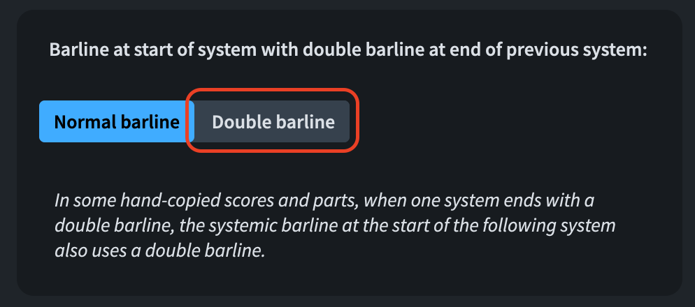 Something that was requested by several users—even if I have personally never seen it in practice—was the possibility to show a double barline at the start of a system when the previous system ended with a double barline. This option has now been added to Dorico 6 and, to activate it, you need to go to Notation Options ▶︎ Barlines, scroll down to the very bottom and select the option to the right: