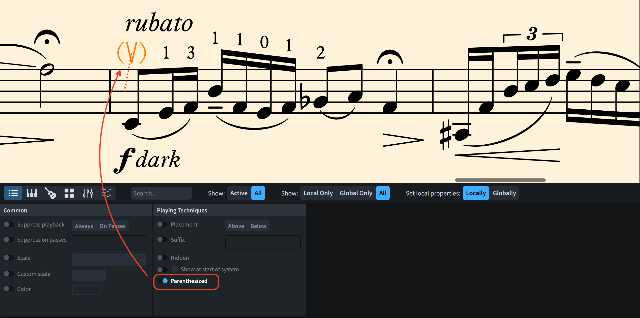 On the Playing Techniques side, it is now possible to set a property on selected instances to show them parenthesised.