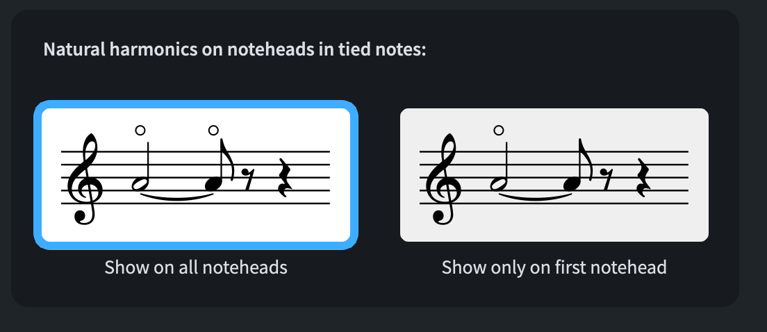 In string writing, natural harmonic circles on tied notes need to be shown on all noteheads in a tie chain. It is a technical requirement because without a circle, the player might be encouraged to press down on the string, producing the same pitch but with a different timbre. A new engraving option allows now this to be the norm. You can find it in the new Harmonics section: