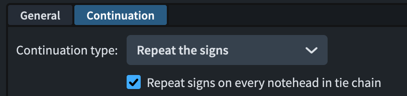 This improvement can now be applied to all glyph-based playing techniques. In the Edit Playing Techniques dialog, open the Continuation page and, when setting the continuation type to Repeat the signs, you will now be offered the choice of including notes in tie chains.