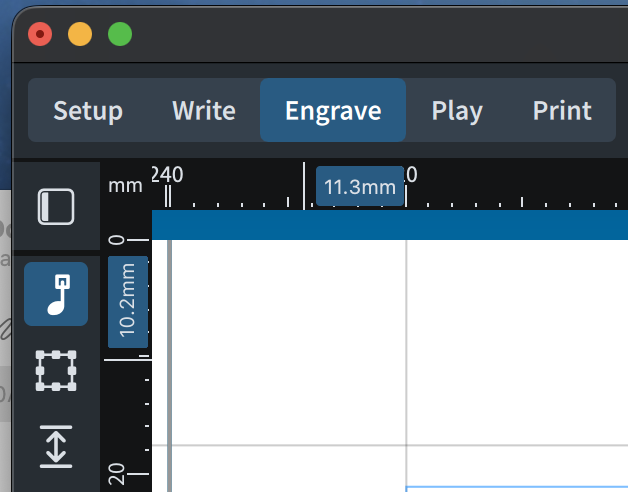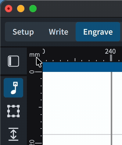 As an engraver who has realised over one hundred scores of highly complex contemporary music, I find this new feature a real godsend. Like all professional desktop publishing, photo editing, and vector drawing programs, it is now possible to show rulers along the top and left edge of the music area. To activate them, go to Engrave mode then, from the Engrave menu, tap on Rulers. The position of the pointer is always shown on the rulers relative to the top-left corner of the page: