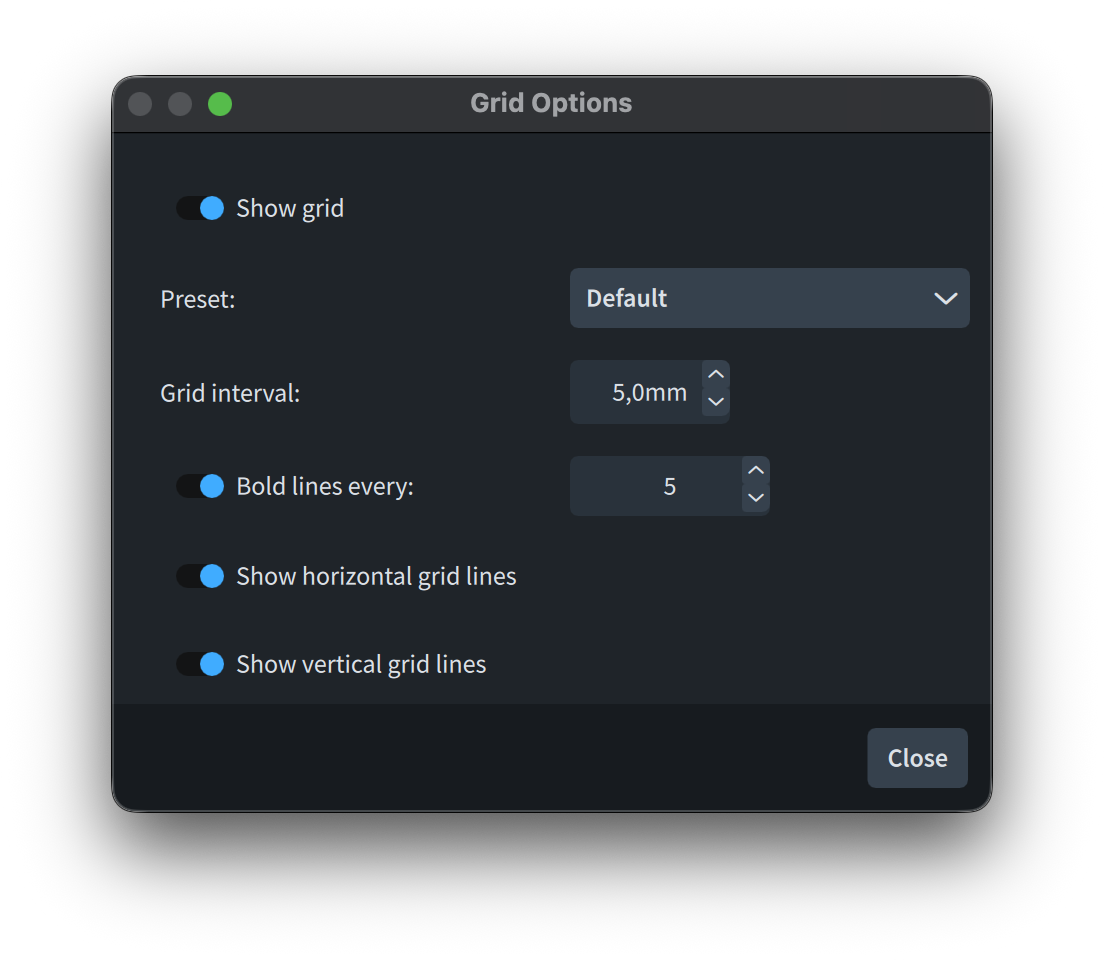 By changing the value shown in the Grid interval spin control, you will create a “Custom” preset, while the Bold lines every: option will let you determine the frequency of the main grid lines. You can even show horizontal or vertical grid lines only by switching OFF/ON any of the last two options.