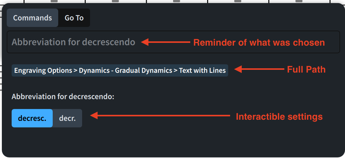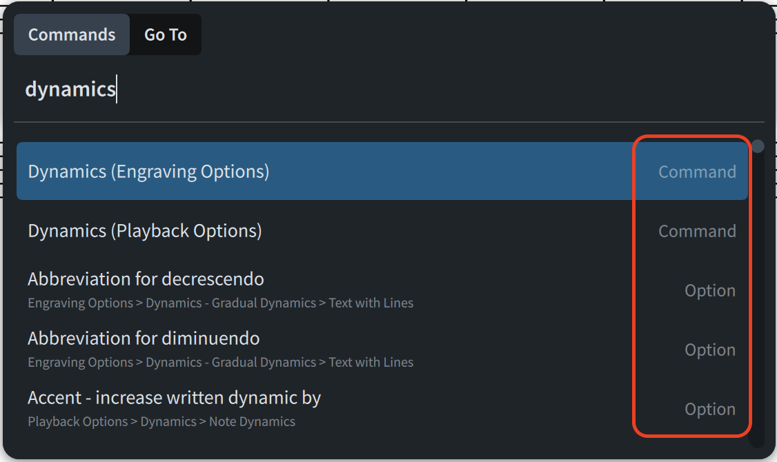 In this case, I browsed for “dynamics” and got presented with a list of possible matches. To the right, you can see that either “Command” or “Option” is shown. Using the keyboard arrows, you can still move up and down the list. Selecting a “Command” and pressing Return will automatically execute that action (for example, the selected command in the picture will open the Dynamics page in Engraving Options). Selecting an “Option”, instead, will behave differently as pressing Return will display the settings for that option (notice also the small faint text showing you the exact path to that option should you want to find it again):