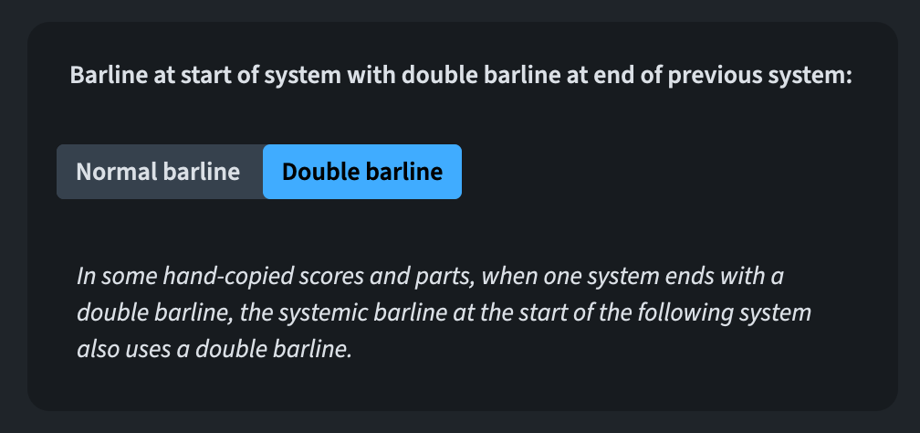 In certain kinds of music, it is necessary to show a double barline at the start of a system when a double barline exists at the end of the previous system. A new option for that has been added in Notation Options ▶︎ Barlines: