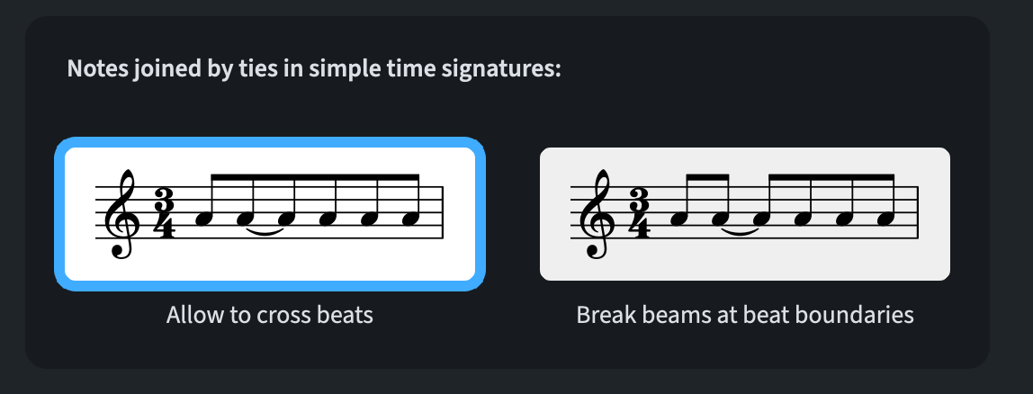 By default, Dorico breaks beams between tied noteheads that would otherwise be joined if they were separate notes. However, this is not a universal practice, so a new option has been added to Notation Options ▶︎ Note Grouping ▶︎ Simple Time Signatures With or Without a Half-bar: