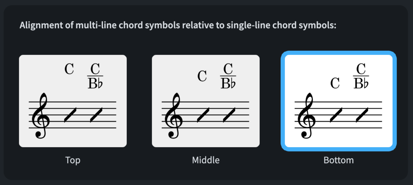 When multiple chord symbols are present in the same system and not all of them have a single line—for example because of different roots—aligning them properly could be a pain. It is therefore now possible to specify how to align them in Engraving Options ▶︎ Chord Symbols ▶︎ Positions: