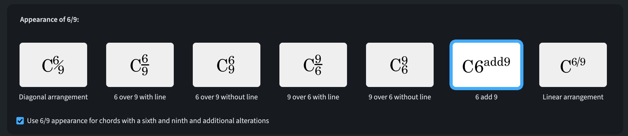 There are two new options added to the Engraving Options ▶︎ Chord Symbols ▶︎ Intervals ▶︎ Appearance of 6/9 page: