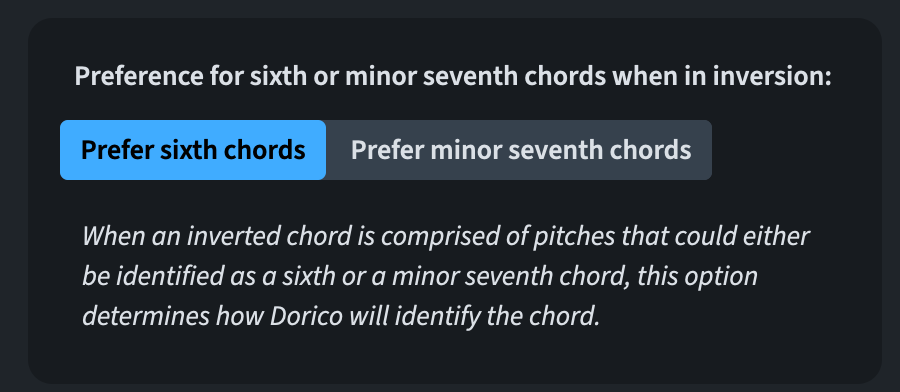 When inputting chord symbols via a MIDI keyboard, Dorico has always had to make certain assumptions for chords that could be interpreted as either 6th (e.g., ‘G6’) or 7th chords (Em7). When there is an inversion, this could become problematic, and a new choice has been added to Note Input Options ▶︎ Chord Symbols: