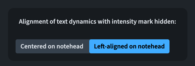Ever since Dorico 1, to write something like “dolce” under a note, we had to write “P dolce” and then hide the dynamic intensity marking. While this could be replaced by a dedicated paragraph style, one would have lost the playback effect or risked duplicating the number of things to do to achieve the same result in a satisfactory way. After hiding the dynamic intensity marking, the prefix/suffix would be again centred under the note, requiring an extra change in the Properties panel. It is now possible to set a new option called Alignment of text dynamics with intensity mark hidden in Engraving Options ▶︎ Dynamics ▶︎ Horizontal Position: