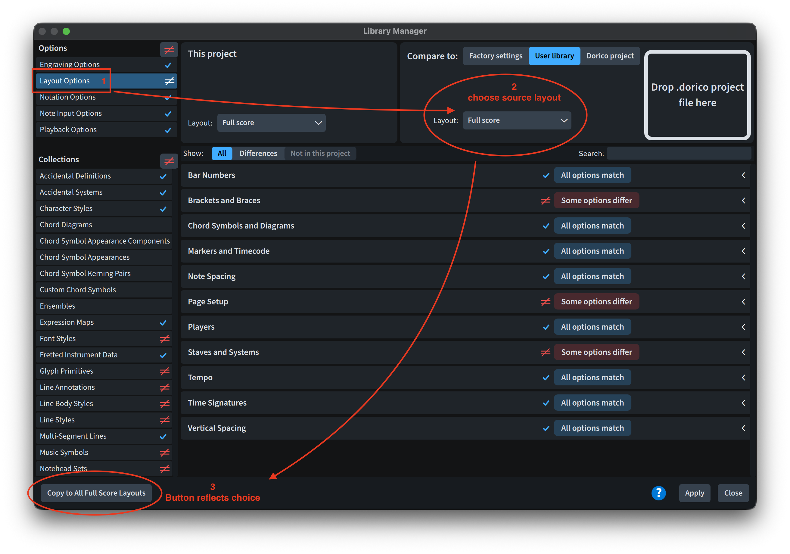 It is now possible to import layout and notation options into all layouts and flows in the project using the Library Manager. When selecting Layout Options in the left-hand side, a new button appears in the bottom-left corner of the window, reflecting the type of layout chosen in the drop-down menu.