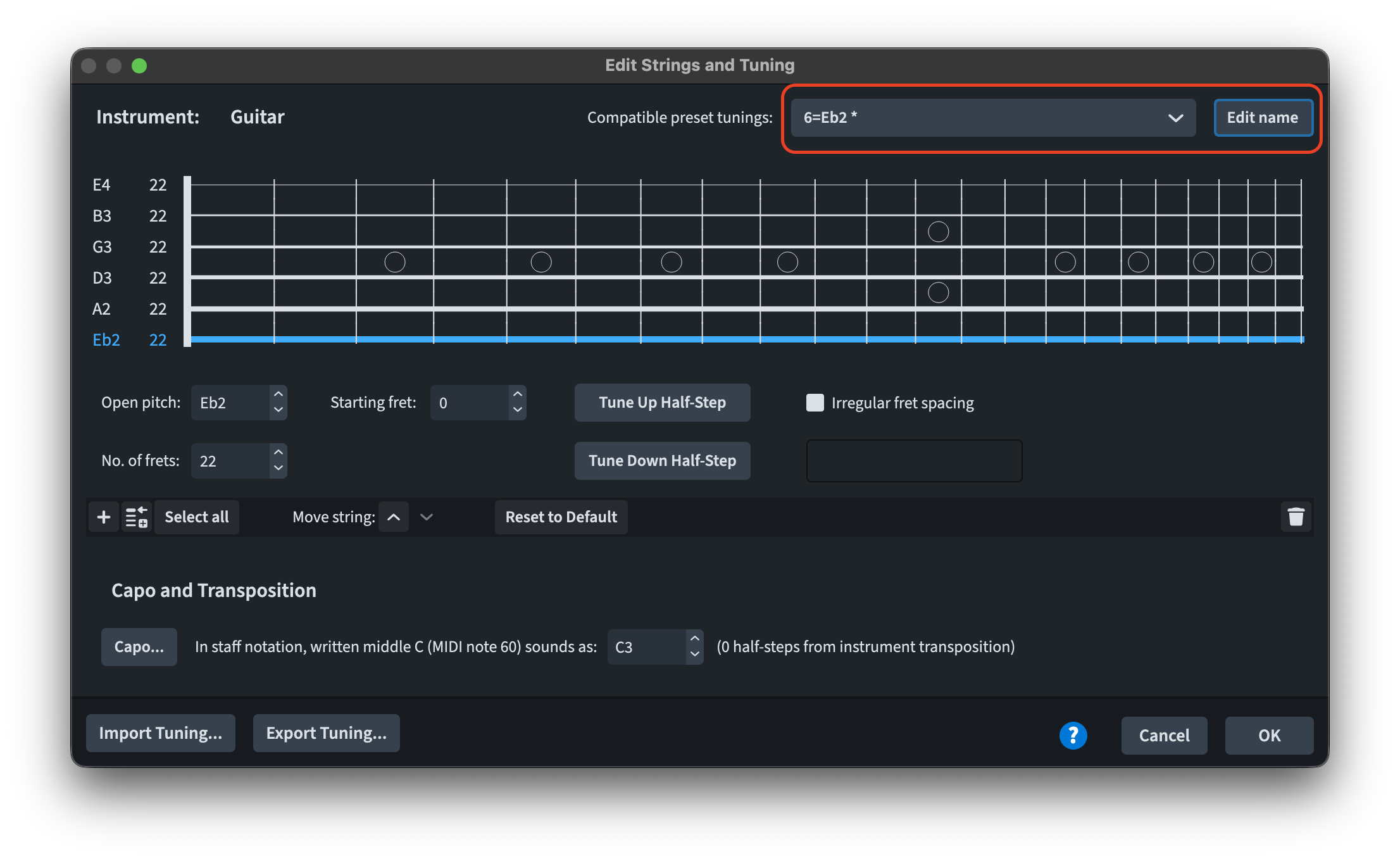 For fretted instruments, it is now possible to give a specific name for a modified or new tuning created in the Edit Strings and Tuning dialogue. The Edit Name button becomes enabled once the edit to the tuning has been completed.