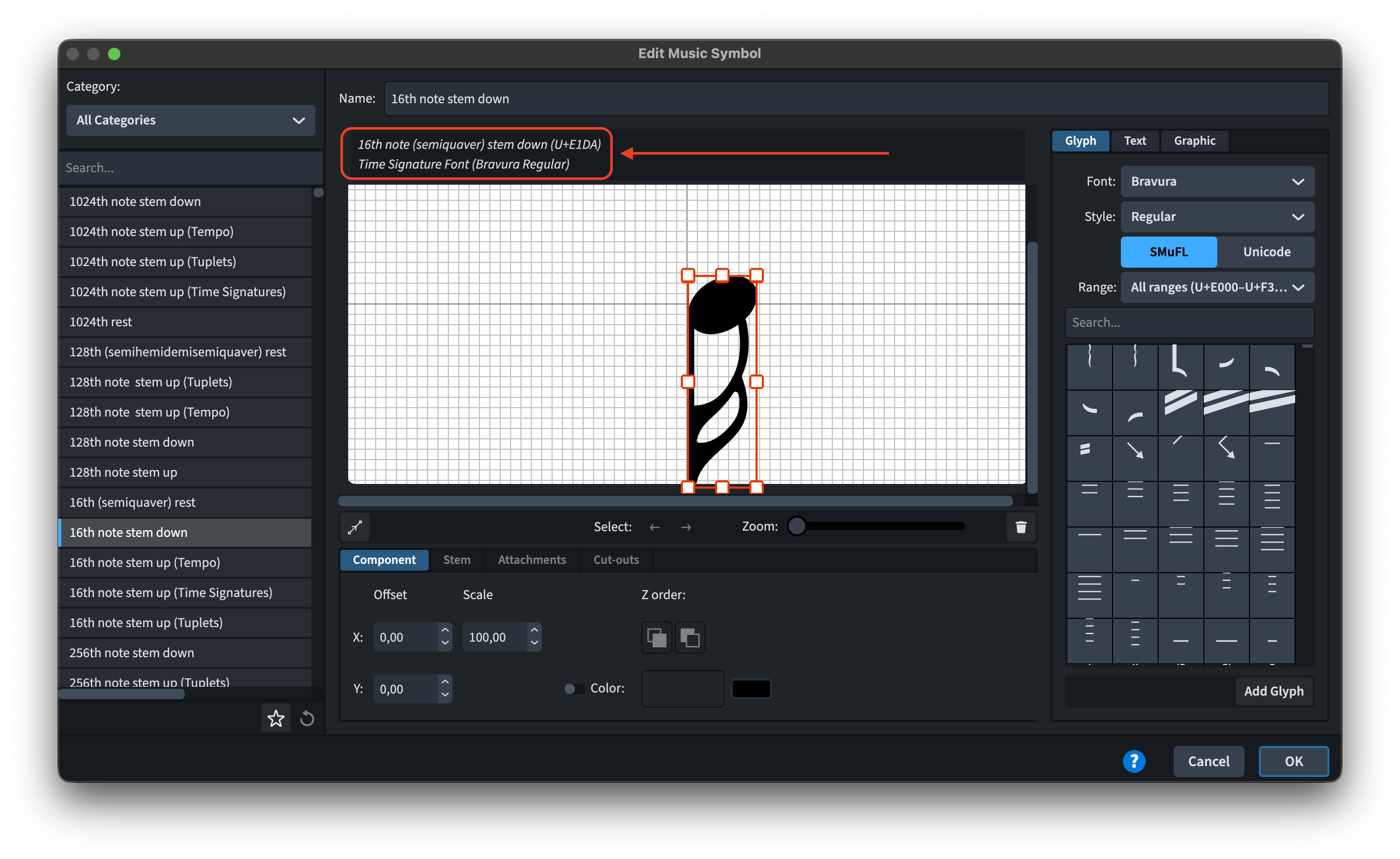The Scale spin box has been simplified, appearing only once unless one is interacting with a graphic (which can be scaled in either direction). Filter search fields have been added to the Glyph, Text and Composite tabs, making it much quicker to find what one is looking for. The SMuFL range menu now also contains an additional filter.