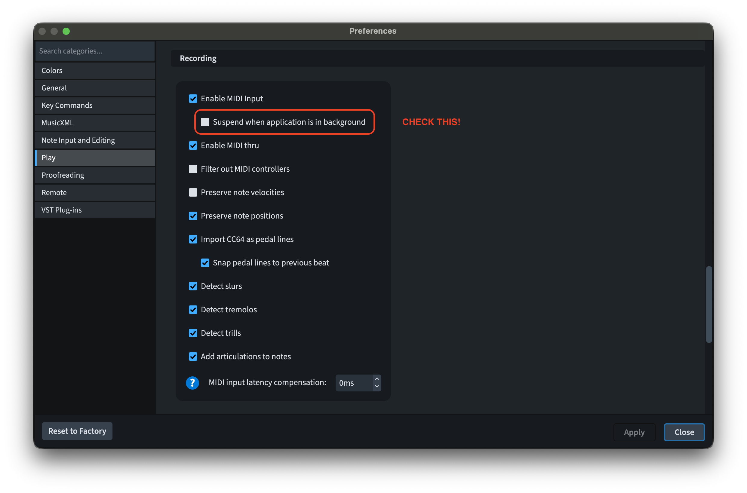 To avoid unwanted material being input in Dorico while MIDI input is active and Dorico is not the in-focus app, there is a new Suspend when in background option to be found in Preferences ▶︎ Play.