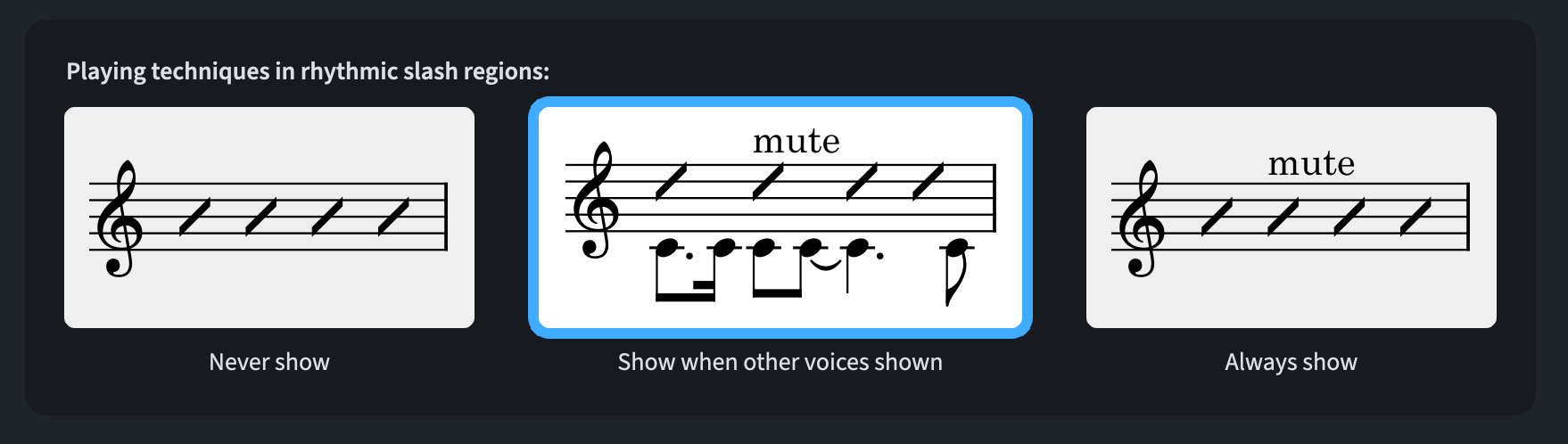 In previous versions, Playing Techniques were only displayed in rhythmic slash regions when the Show other voices property was active. A new option has been added to Engraving Options ▶︎ Playing Techniques ▶︎ Rhythmic Slashes to provide more flexibility: