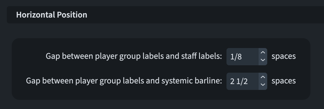 In Engraving Options ▶︎ Staff Labels, a new option called Gap between player group labels and systemic barline has been added (scroll to the very bottom). This will be used when a player group label is shown but no staff labels are visible.