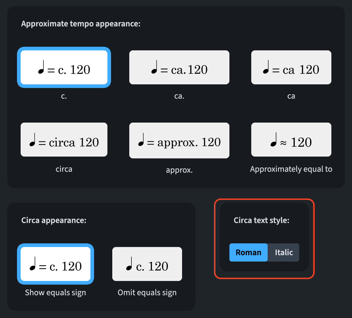 A new Circa text style option has been added to Engraving Options ▶︎ Tempo in the Absolute Changes section.